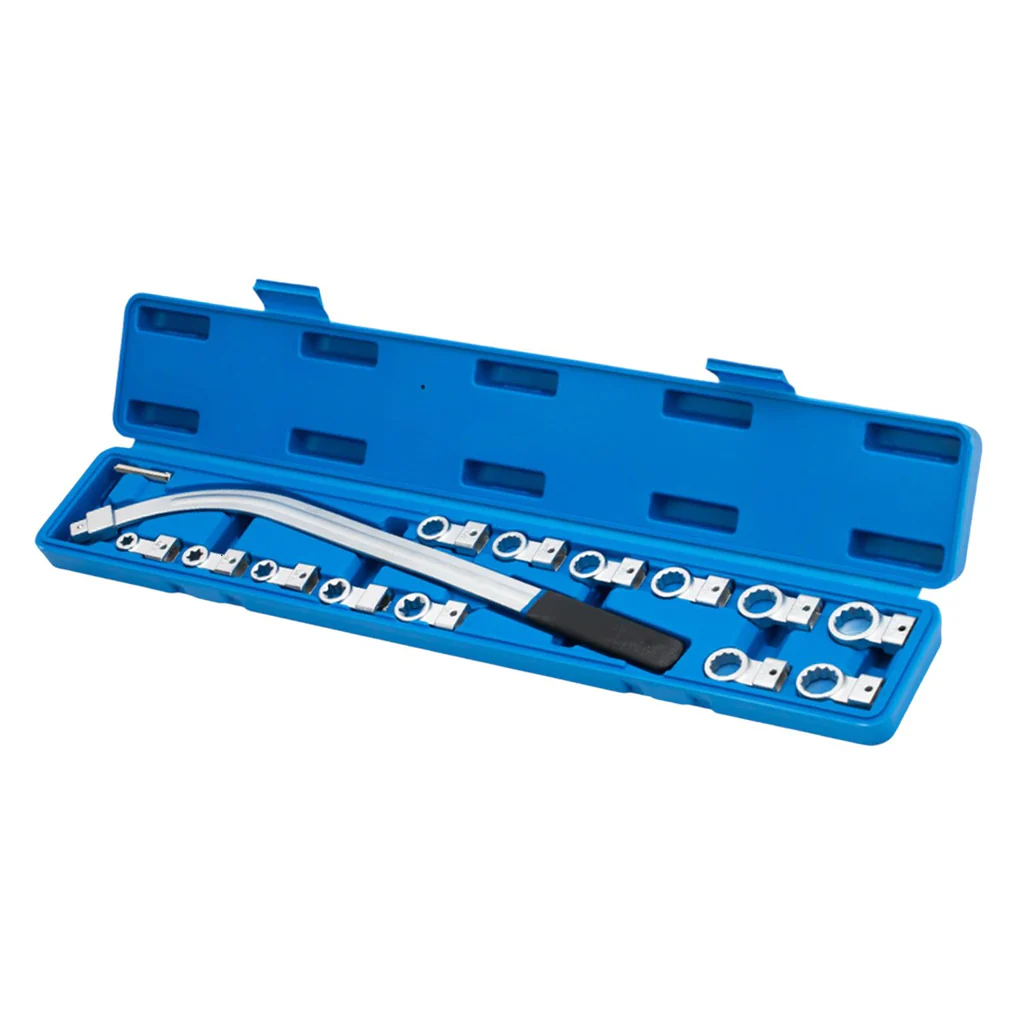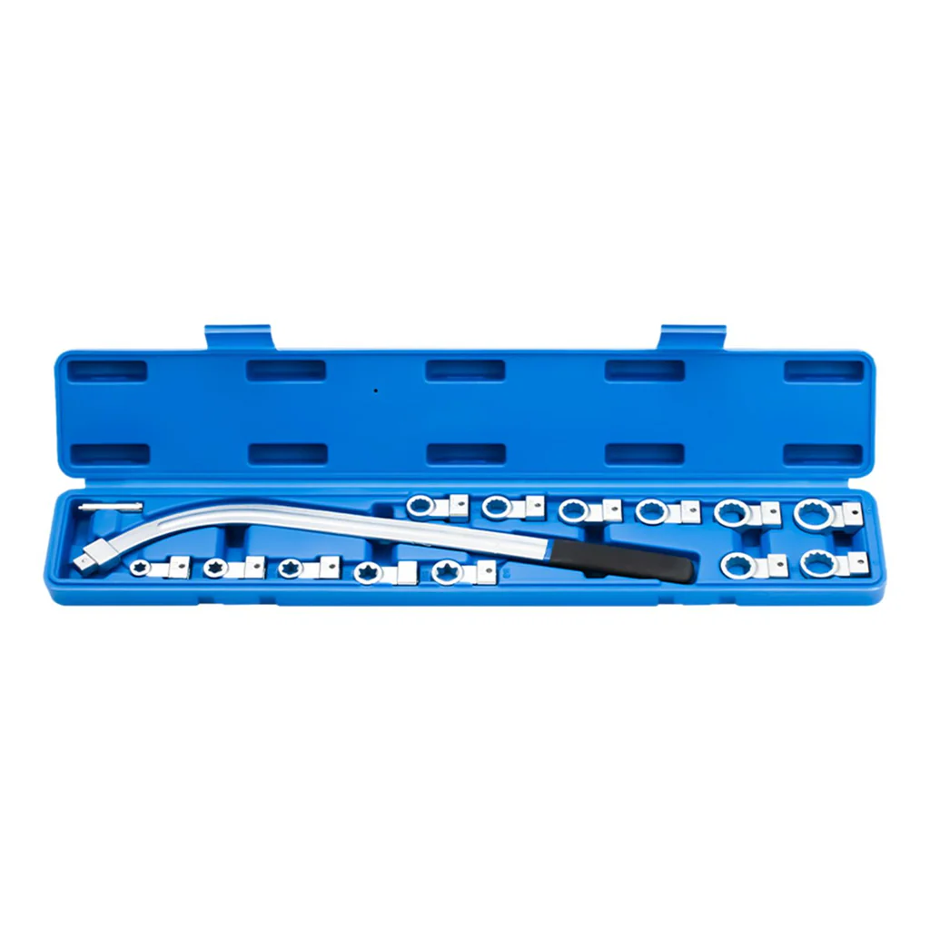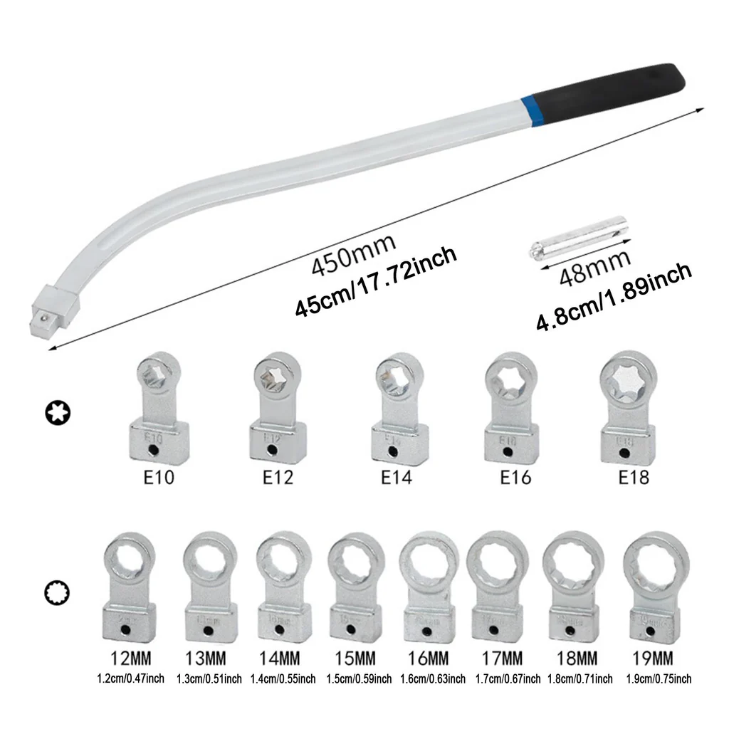 • Package Inventory: The package includes 1 long curved wrench, 5 x Torx adapters (E10, E12, E14, E16, E18), and 8 x 12-point adapters 0.47" to 0.74" (12mm, 13mm, 14mm, 15mm, 16mm, 17mm, 18mm, 19mm). It provides a comprehensive selection for working with a wide range of fasteners commonly found in automotive repairs.
