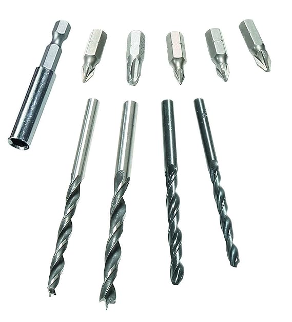 Package Contents: 7.2V Lithium-ion drill driver, 1.5Ah battery (integrated)400mA, Jack plug charger, 3m tape measure, 1 x magnetic bit holder, 1 x 25mm PH screwdriver bit (Ph2), 1 x 25mm Slot 5 screwdriver bit, 1 x 25mm Hex 4 screwdriver bit, 2 x 25mm PZ screwdriver bits (Pz1,2), 2 x HSS drill bits (4,5mm), 2 x wood drill bits (4,5mm) and Drawstring bag