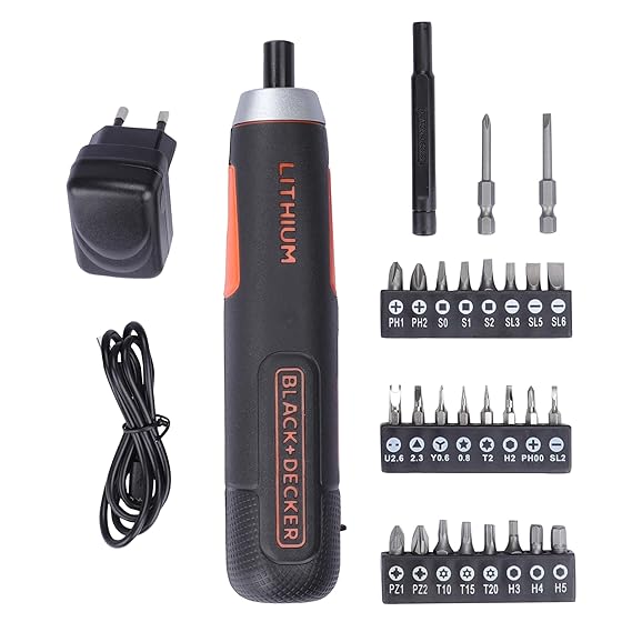 BLACK+DECKER BD40K27 4V 6.35mm Li-ion Cordless Screwdriver with E-Clutch and Intelligent Torque System with 2 LED Worklights & 27-Piece Accessories for Home & DIY Use, 1 Year Warranty, ORANGE & BLACK