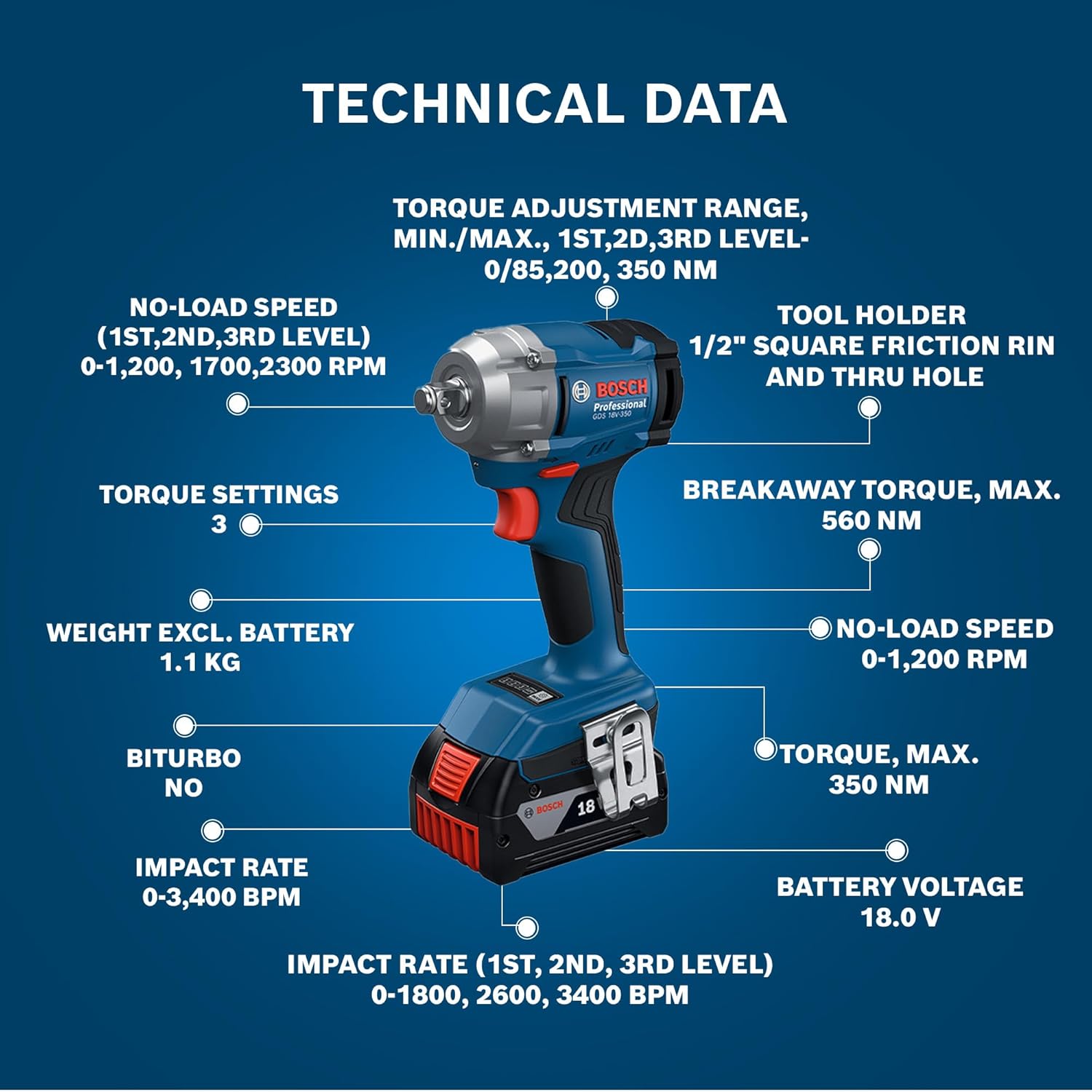 • Compact Powerhouse – The BOSCH GDS 18V-350 Professional features a compact 131 mm head and brushless motor, delivering efficient performance in tight spaces and demanding applications.
