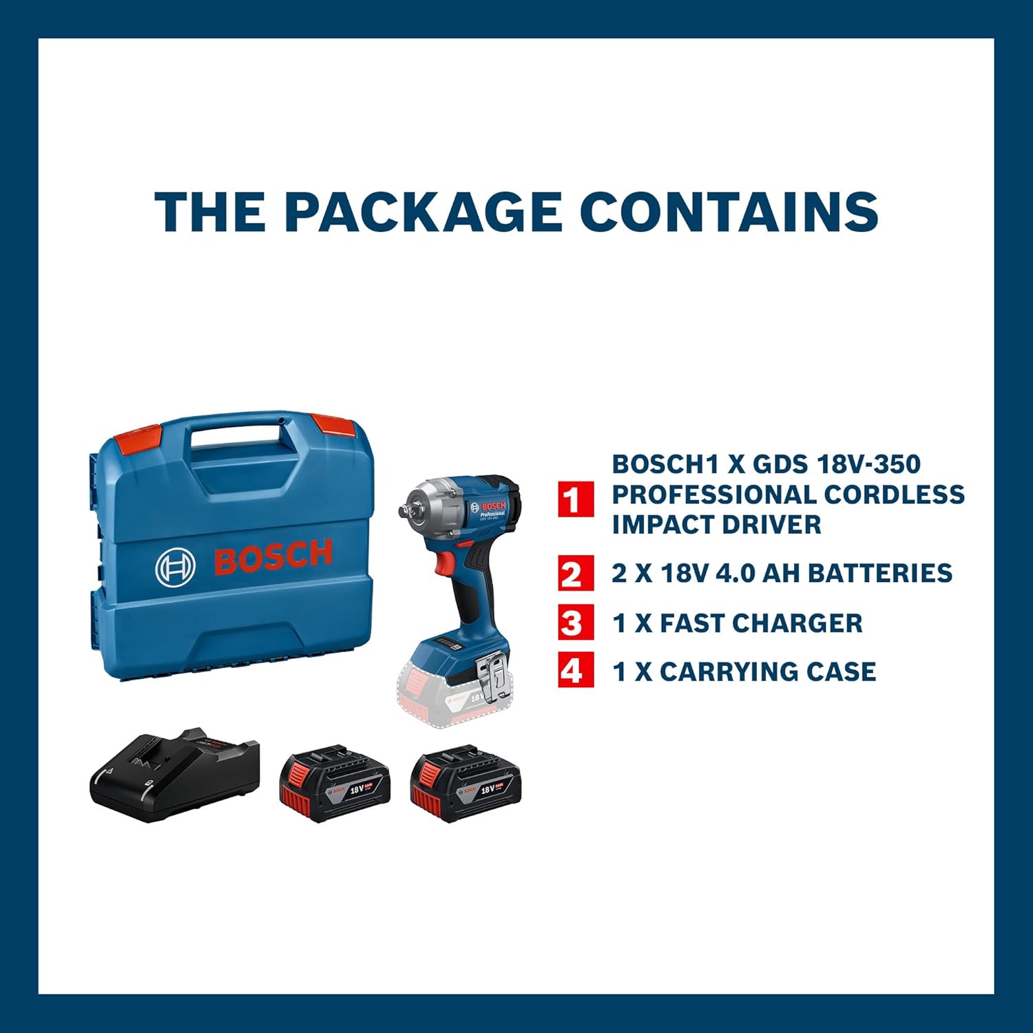 BOSCH GDS 18V-350 Professional Cordless Impact Wrench with Brushless Motor, Compact 131 mm Head, Multiple Torque Settings up to 350 Nm for Efficient Bolting, 1 Year Warranty