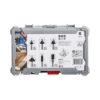 It features a transparent cover for visibility of the content. The set is available in three versions, either in 6 mm, 8 mm, or 1/4-inch shank diameter, to cover compatibility with all common handheld routers.