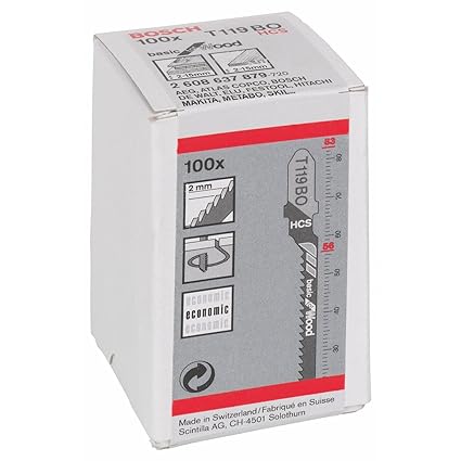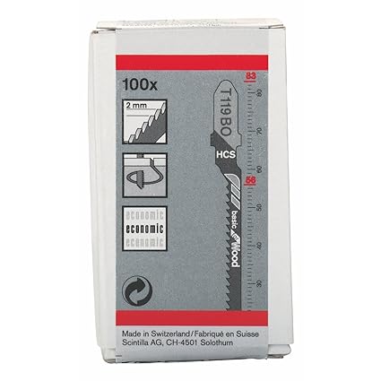 Bosch Professional Jigsaw Blades T 119 Bo, For Cuve Cuts, Blade Length 83Mm, Suitable For Softwood(2-15 Mm), Ply, Chipboard, Wood Core Ply, Fibre Boards, Pack Of 100
