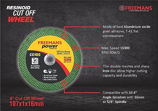 HIGHER CUTTING CAPACITY & DURABILITY: Each 4-inch Green Cut Off Wheel has a size of 107*1*16mm. Thin double meshes and sharp Inox disc allow higher cutting capacity and durability PREMIUM MATERIAL: Made of best Aluminium oxide grain abrasive combinations with double fibreglass reinforcement. PACKAGING: Contains 100 pieces per box, to meet your jobsite requirement. COMPATIBLITY: Cuts all metal, steel, MS rods, Stainless steel Pipes, Steel Channels, steel bars, MS pipes used in plumbing work, Steel Channels, steel bars, TMT bars used in construction. Compatible with All 4” Angle Grinders with 16mm or 5/8'' Spindle. WARRANTY: 3-year warranty from the date of manufacturing.