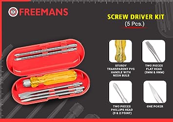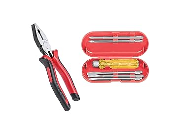 5pc Screw Driver kit: Sturdy transparent PVC handle with neon bulb 5pc Screw Driver kit: Two pieces flat head (3mm & 6mm) 5pc Screw Driver kit: Two pieces Phillips head (0 & 2 point) 5pc Screw Driver kit: One poker. Combination Plier: Chrome vanadium steel body Combination Plier: Induction hardened cutting jaws Combination Plier: Double colour thick PVC sleeve for better insulation Combination Plier: Black phosphate head for better resistance to corrosion