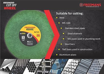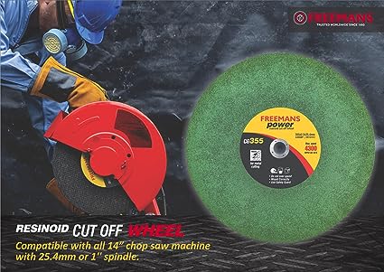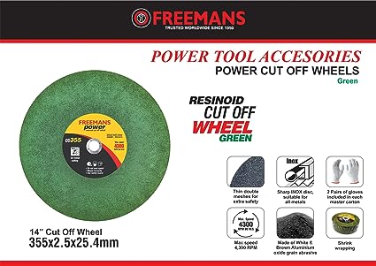 HIGHER CUTTING CAPACITY & DURABILITY: Each 14-inch Green Cut Off Wheel has a size of 355*3*25.4mm. PREMIUM MATERIAL: Made of best Aluminium oxide grain abrasive combinations. PACKAGING: Contains 25 pieces per box, to meet your jobsite requirement. COMPATIBLITY: 14'' Abrasive cut off wheel is designed for general cutting of metals, such as steel, Steel Channels, angle iron, and other Ferrous metals, MS pipes used in industries, TMT bars used in construction. Compatible with All 14” Chop Saw Machine with 25.4mm or 1'' Spindle. 3 year expiry from date of manufacturing.