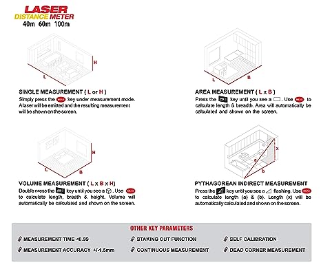 PROFESSIONAL LEVELS OF ACCURACY: The laser distance meter provides an accuracy of upto +/-1.5mm. A Vial bubble is present for increased levels of precision. Available in 40m, 60m and 100m measurement ranges