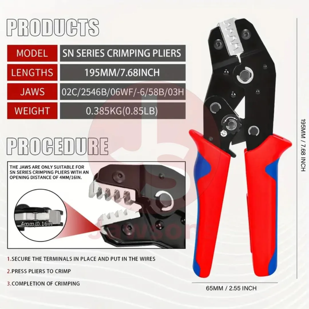 Versatile Functionality:Equipped with six interchangeable jaw sets, making it suitable for insulated terminals, non-insulated terminals, and Dupont connectors.