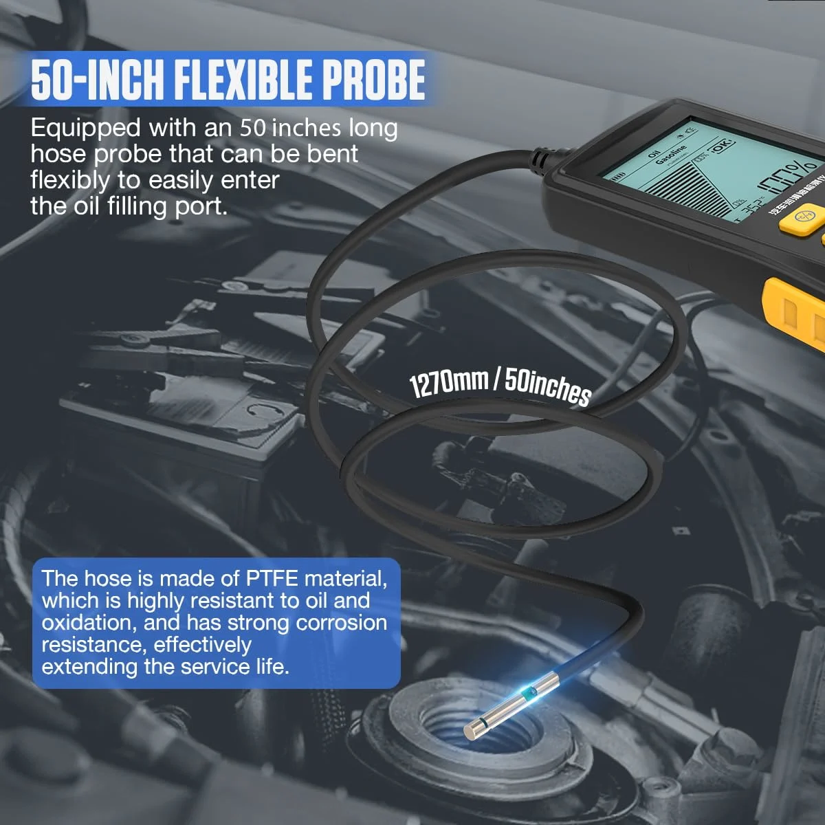【High-precision Sensor & 800MM Flexible Probe】Engine oil tester probe adopts an integrated high-precision photoelectric sensor and temperature sensor,which provides fast and sensitive response and more accurate measurement results.It is equipped with an 800MM long hose probe that can be bent flexibly to easily enter the oil port. No need to take the oil out to test.The hose is made of PTFE material, which is highly resistant to oil, oxidation and corrosion,effectively extending its service life.