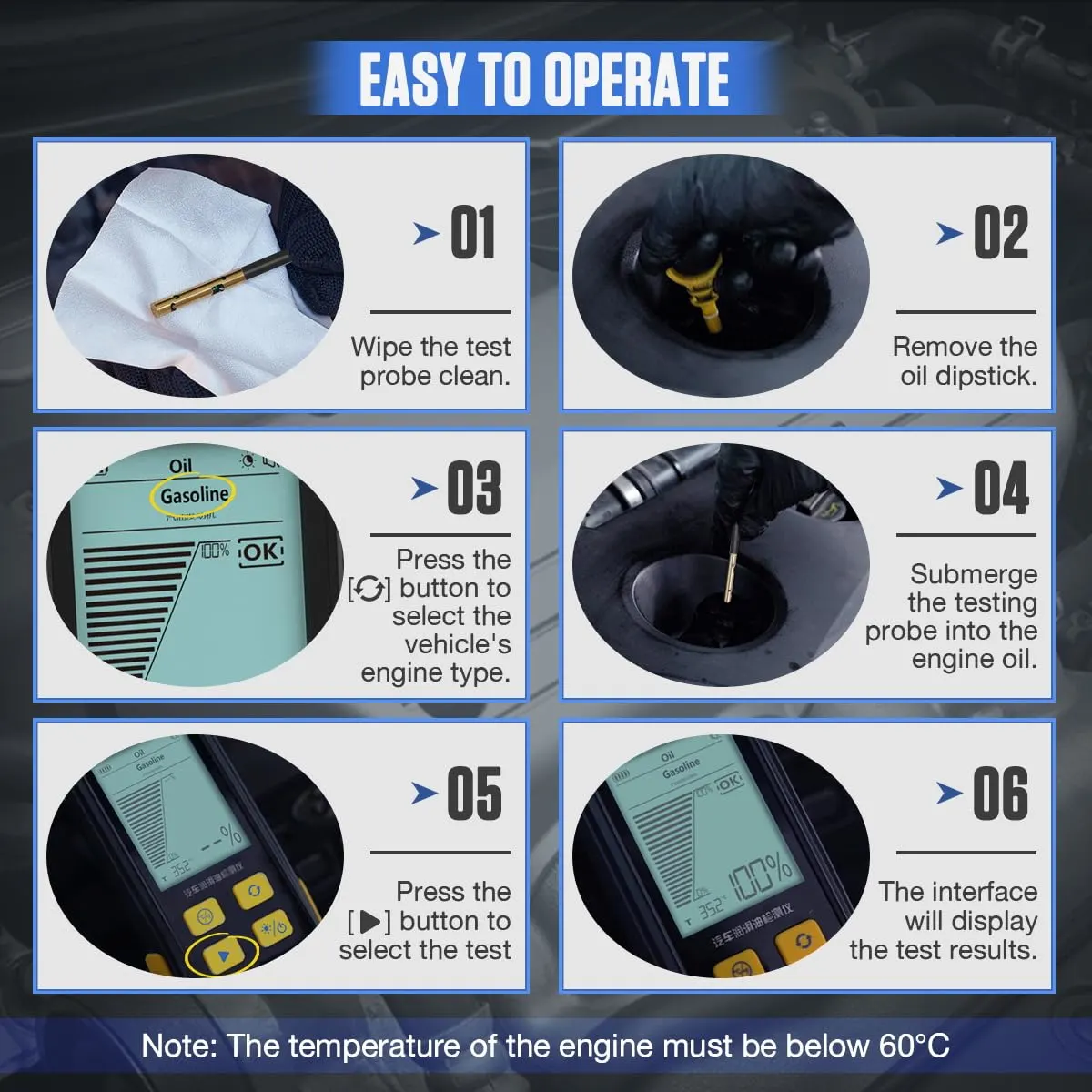 【Warmly Note】 1. Please check the temperature displayed on the dashboard of your car before testing. The engine temperature must be below 60°C during the test. 2. Please wipe the test probe clean before testing, and make sure the probe is immersed in oil during testing.