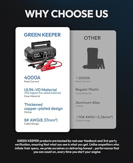 GREEN KEEPER GK-J1205 Car Jump Starter 4000A 12V for Vehicles Fast Charger Power Bank with USB C Ports, LED Light, Smart Protection