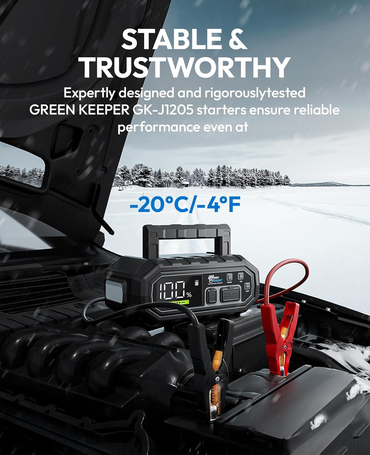 • All-in-One Portable Car Jump Starter: The GK-J1205 Jump Starter is a comprehensive car jump starter kit. It comes with a jump start battery pack, heavy-duty jumper cables, a Type-C charging cable, a cigarette lighter adapter, and a durable carrying case. Whether you have a sedan, SUV, motorcycle, or boat, this portable car jump starter ensures you’re never stranded with a dead battery. Designed for all weather conditions, it operates effectively from -20℃ to 60℃ (-4°F to 140°F), making it a reliable companion for all your adventures.