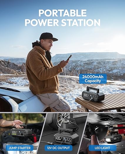 • Multifunctional Car Jumper Starter Portable: This car jumper starter portable device does more than just jump start your car. It includes an 88.8Wh lithium battery with multiple output ports, including a QC18W USB-A port and a PD65W Type-C port, making it perfect for charging your smartphones, tablets, laptops, and other USB devices on the go. The built-in LED light with multiple modes (Lighting/Strobe Light/SOS) adds to its versatility.