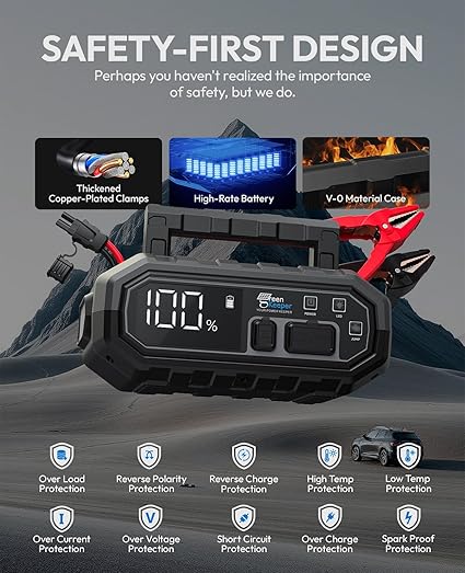 • Jump Start Battery Pack with Safety in Mind: Safety is paramount with the GK-J1205 Jump Starter. Equipped with an intelligent protection system, it features overcurrent, overcharge, overdischarge, and short-circuit protections, along with spark-proof technology and reverse polarity protection. This ensures safe and secure operation, giving you peace of mind during emergencies.