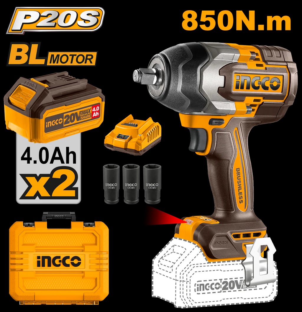 Ingco 20V 850NM Lithium-ion Impact Wrench, CIWLI2085 With 2 Batteries & Charger