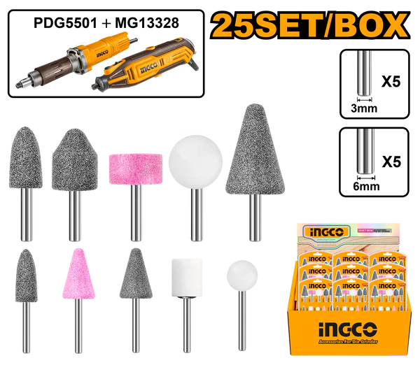 The set of 5 grinding burrs, featuring a 6mm shank, is specifically designed for compatibility with Ingco PDG4003 and PDG5501 Die Grinders. These burrs offer precision and efficiency in a range of grinding tasks.