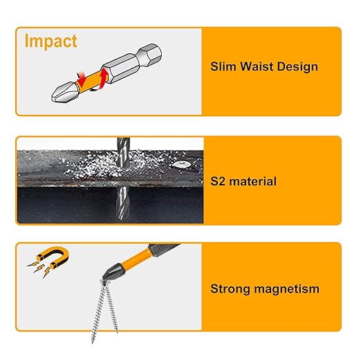 High-Quality Material : S2 material impact bits, higher toughness, torque, and wear resistance, longer service life; phosphating blackened bits, wear-resistant and corrosion-resistant.