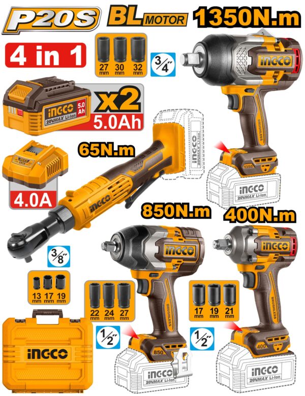 Ingco All in One 20V Brushless 4 Pcs Impact Wrench(3 Impact wrench+1 Ratchet wrench) Combo Kit With Battery, Charger & Socket Set (COSLI250783)