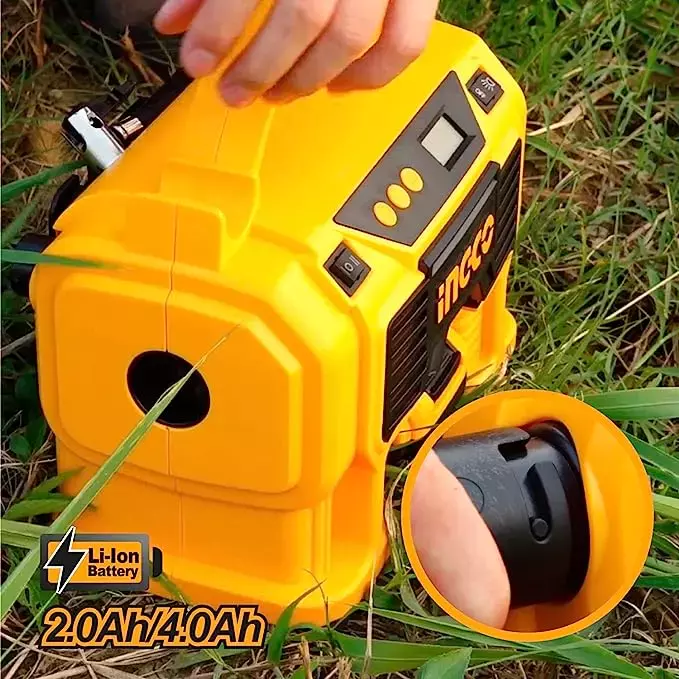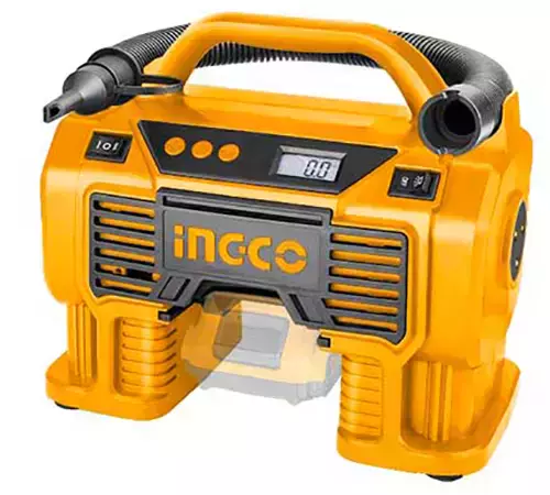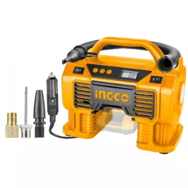 The Ingco 20V Lithium-Ion Auto Air Compressor is a compact, digital, portable, high-volume air compressor. With its built-in storage compartment for the air hose, this is the only tool you’ll need in an emergency. Ideal for inflating tyres and other sports equipment such as basketball and soccer balls, this auto air compressor can inflate to 160 PSI (11 BAR). This auto air compressor features a digital pressure gauge which gives accurate readings and lets you know when your tyres are properly inflated, making it safer to drive. The design also makes it light enough so that it's easy to carry around and store when not in use.