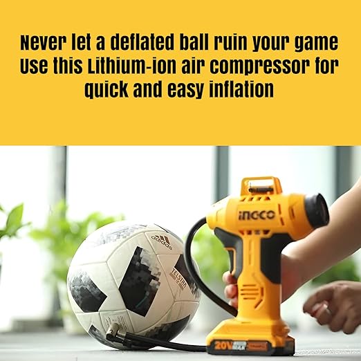 The INGCO 10 Bar Lithium-Ion Auto Air Compressor (CACLI2018) delivers powerful inflation with a maximum pressure of 10 bar. Featuring a 20V lithium-ion battery, it ensures portability and convenience for on-the-go use. The compressor comes with three adapters, making it versatile for inflating tires, sports equipment, and more. Compact and user-friendly, it's a must-have for any toolkit