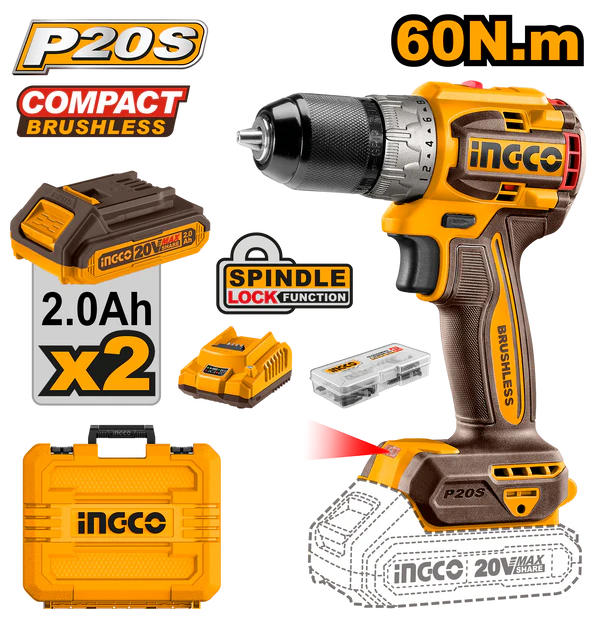 Ingco CDLI20602 Compact Brushless Cordless Drill – 20V, 60Nm Max Torque