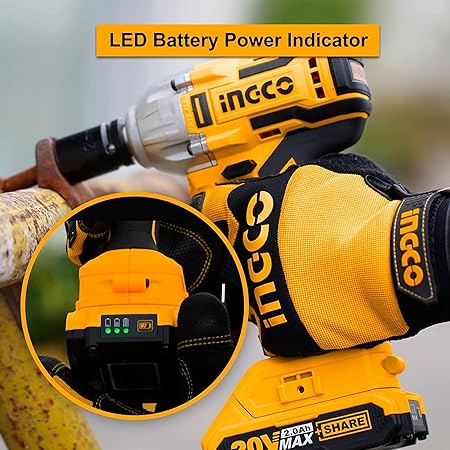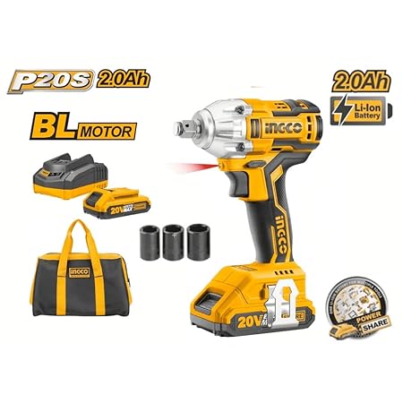【Brushless Motor】Compare with other brands, INGCO brushless impact wrench takes pure copper motor, which produces less heat after long-time use, the cool tool body and li-ion battery easily satisfy your working, meanwhile NO smoking or spark! Even as an amateur or women, you'll drive it pretty easily! 【A Beast for Large Range of Application】 With compact and cordless design, the 300NM high torque impact wrench can easily get into tight spaces others can't, 2-speed mode and up to 3300 RPM will save your time dealing with any hard work, like removing tires from cars, commercial vehicles, motorcycles, trucks, and trailers, automotive repairs, major construction projects, heavy equipment maintenance, or product assembly. 【INGCO Li-ion Technology】20V Lithium battery (2.0aH) gives more power to the impact wrench and a longer workload, fully charged in just 2.5 hours with the quick charger. You don't have to change the battery frequently anymore, so you can save some time to fill yourself with your DIY work, home repairs. Go withINGCO impact wrench, and accomplish more than you ever expected! 【LED Light for Increased Visibility】Build-in bright LED light enhances visibility in the dark working areas, surprisingly helpful when working under vehicles where it can be a pain to keep having a worklamp follow you around. 【One Button Reversal】Quick Chuck combines the functions of electric screwdriver and impact wrench; Pistol handle set for a more comfortable and balanced grip