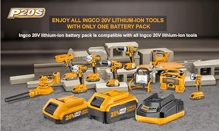 【What You Can Get】INGCO 20V Lithium-Ion rotary hammer , 4.0Ah Battery and Charger , With 1* Adjustable wrench, 1*Long nose plier, 1*Slotted screwdriver, 1*Phillips screwdriver, 6PCS SDS-plus Drill Bits (6x150, 8x150, 10x150mm,10x160m,6x110mm,6x160mm), packed by color box.