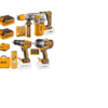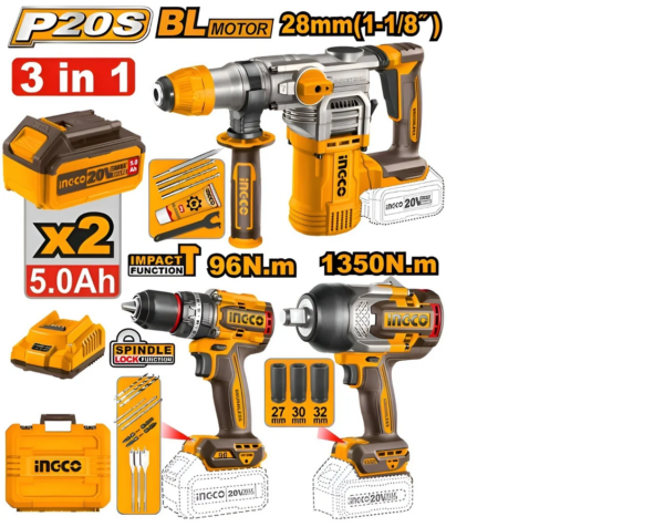 The kit includes a cordless rotary hammer drill, cordless impact wrench, and a cordless impact drill, along with essential accessories.