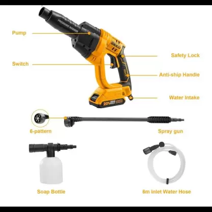 Input Voltage: 20V Max. Pressure: 24.8 Bar Flow Rate: 2.2LPM Auto Stop System Safety Lock Included 1 Pcs 2.0Ah Battery (FBLI2001) 1 Pcs Fast Charger (FCLI2001E) 1 Set 6-patttern spray gun 1 Pcs 6 m water inlet hose with quick connector 1 pcs 400ml foam producer 1 Pcs portable bag