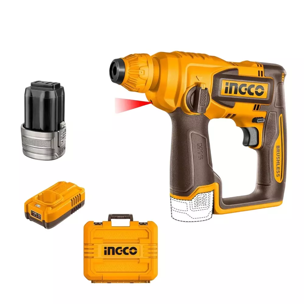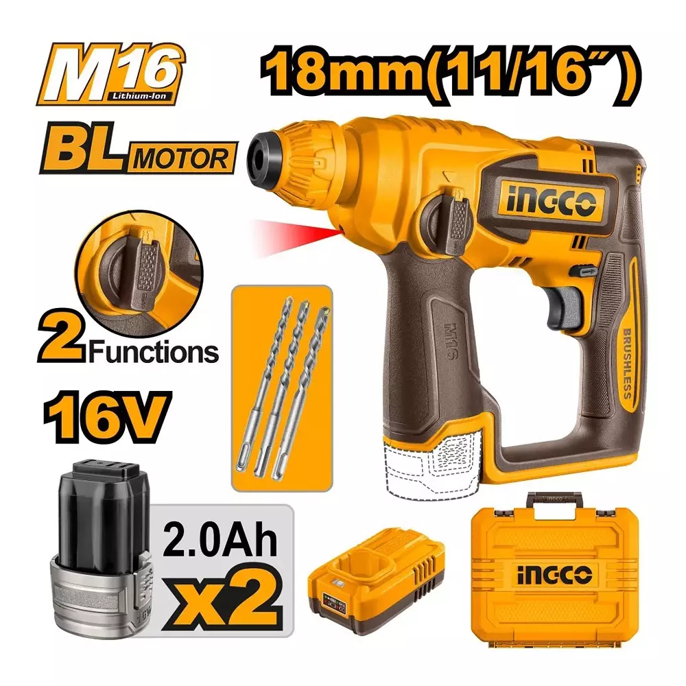 Ingco CRHLI16168 18mm SDS Plus Chuck Cordless Rotary Hammer With Battery, Charger & Drill Bits
