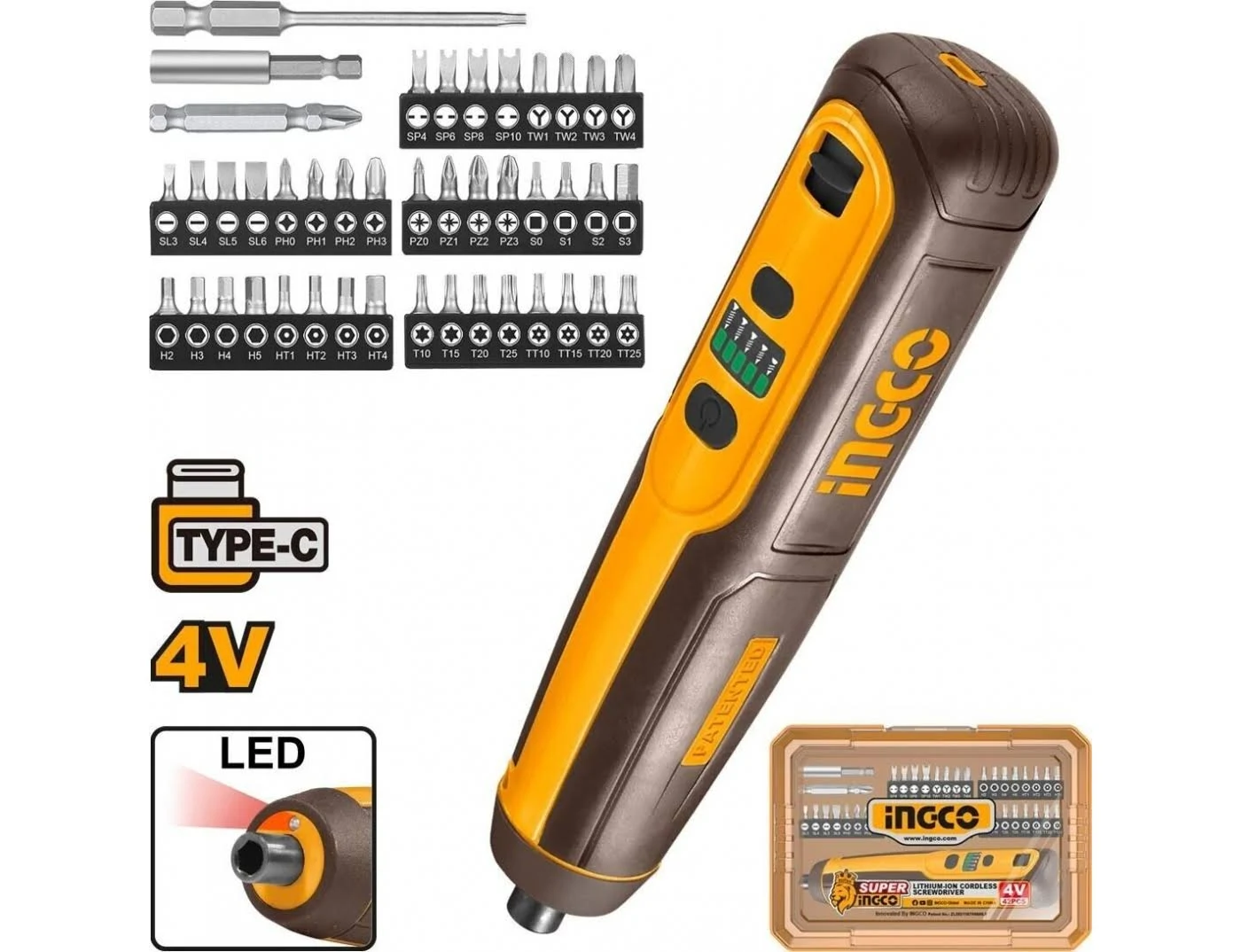 Ingco CSDLI04062 4V 5N.m Lithium-Ion Cordless Screwdriver With R/F Function, LED Light & 43 Pcs Accessories, 240 RPM
