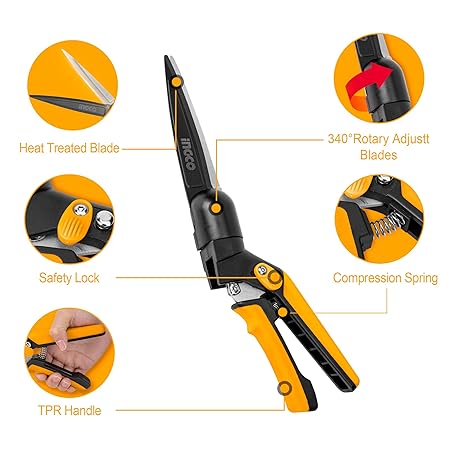 【ROTATING HANDLE 】– The ability of INGCO Grass Shears to turn the shears 340 degrees, without contorting your wrist to reach corners or other areas not easily accessible, makes your next chore a breeze 【STRONG STEEL BLADES】– These the7"/180mm sharp blades takes heat treatment w/non stick coating, prevents the blades from jamming or sticking to give you smooth, clean cuts every time 【DELICATE LAWN WORK WITH EASE 】- This Trimming Shears is most useful when manicuring the border of walkways and in other areas with grass growing right up to the edges and in shaping small hedges 【ERGONOMOC DESIGN 】Easy-open lock protects the blade during transport and storage. ABS handle with TPR grip, comfortable grip 【QUALITY FIRST】 Strict quality inspection make each of our products high performance. This Grass Shears is covered by our lifetime warranty and 30 days money-back. If you have any issues with the quality or usage, please don't hesitate to contact us, we will offer you a best solution in 24 hours
