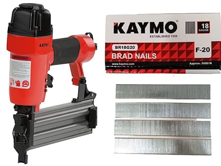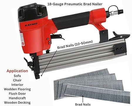 PNUEMATIC BRAD NAILER KAYMO NEO-PB18G50 & NailsDurable full aluminium magazine and slider Curved metal trigger for fast operation of tool, Integrated safety device for safe nailing360 degree top air exhaust, Brad nail depth adjustment to suit different lumber varities Front brad nail unjamming catchInternal brass servo valve parts that do not corrode. 18 Gauge Brad Nails F-series (Pack of 5000 Nails)All spare parts & servicing are available in Kaymo | 6 months warranty on manufacturing defect. Built for reliability and user comfort, this tool offers excellent control and durability, making it ideal for both professional and DIY use. Designed to reduce fatigue while maintaining precision and safety.