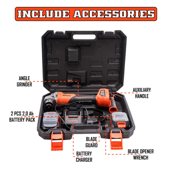 KP Tech Cordless Angle Grinder | 20V | 5000-9000 RPM Speed | 100MM Disc Diameter | Digital Display Speed Function | 2 Pcs 2.0 Ah Battery | 1 Pcs Charger | 1 Pcs Disc Wheel Guard | 1 Pcs Side Handle