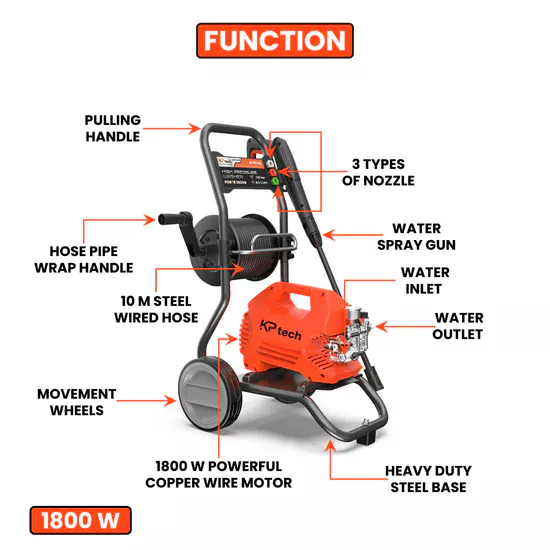 KP Tech BK-PWT1800 High pressure washer 1800W | 130Bar(1850PSI) Pressure | With 3 Axial-plunger wobble-plate pump