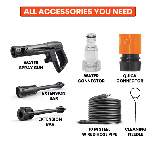 - Hose Length:Â 10m High Pressure Hose (Steel Wired) for extended reach and durability