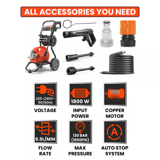 - Max Pressure:Â 130 Bar (1850 PSI) for powerful cleaning