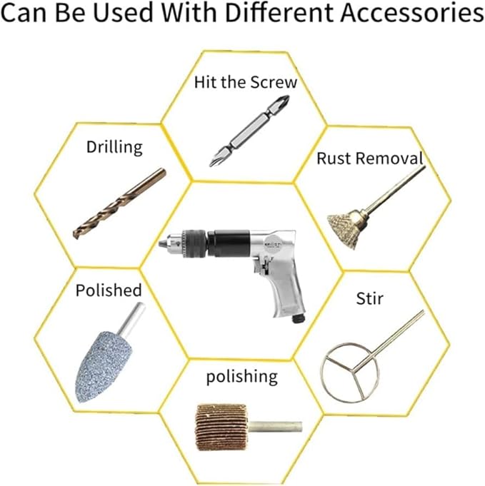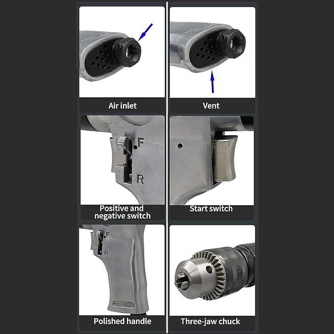 Improve efficiency: This pneumatic drill will help you achieve high efficiency and high precision drilling. Air pressure: 90PSI/6.3Bar.Air inlet thread: 1/4” NPT.Air consumption: 4CFM* (144 ltr/min). Reversible design: The switch that supports reversible rotation is convenient and practical, with high sensitivity. Chuck Size: 10mm, No Load Speed: 1700Rpm Comfortable handle: The handle of this pneumatic drill uses ergonomic design, long-term use, not easy to fatigue, and easy to handle.