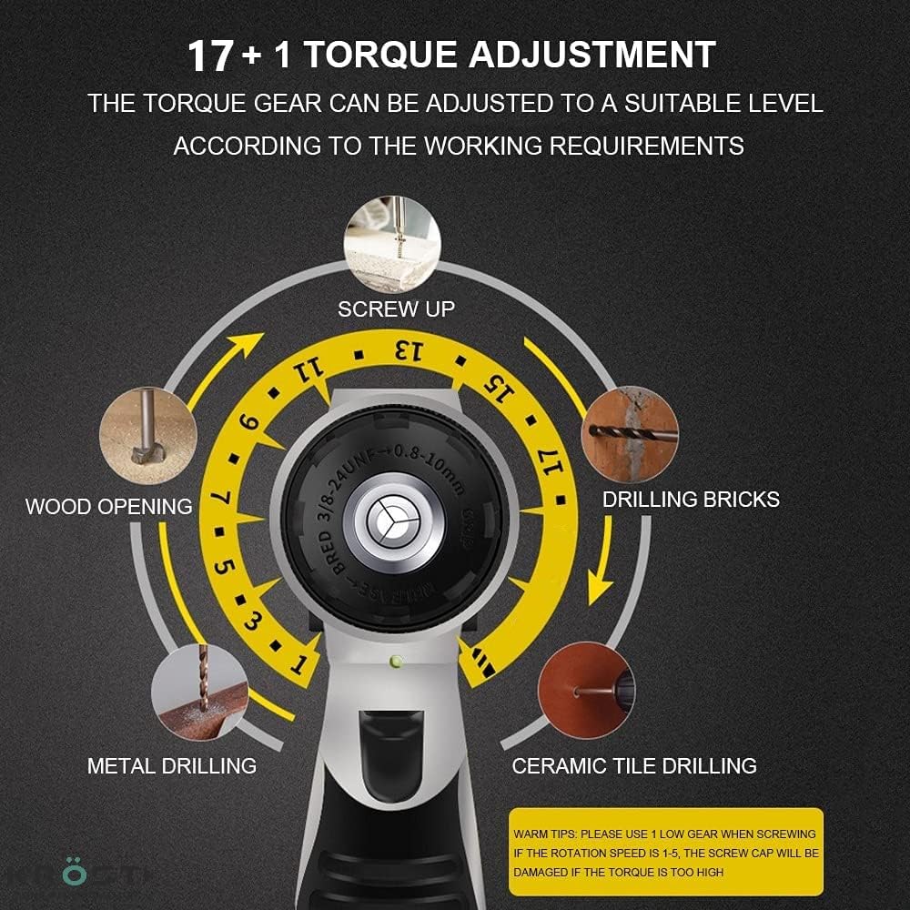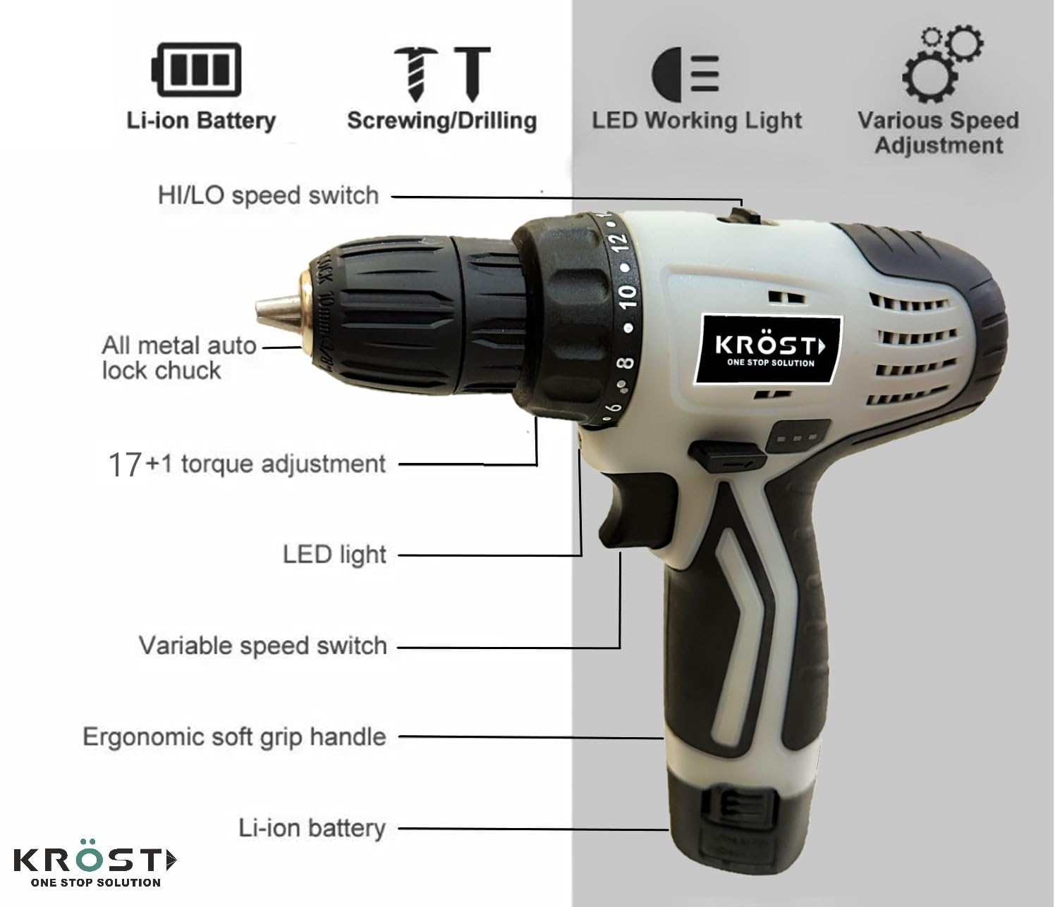 KROST 12V Li-ion Dual Speed Keyless Chuck Drill |Cordless Drill Kit | Drill Driver | Screwdriver with 2 Batteries, LED Torch Variable Speed and Torque Setting Extra 30 Tools