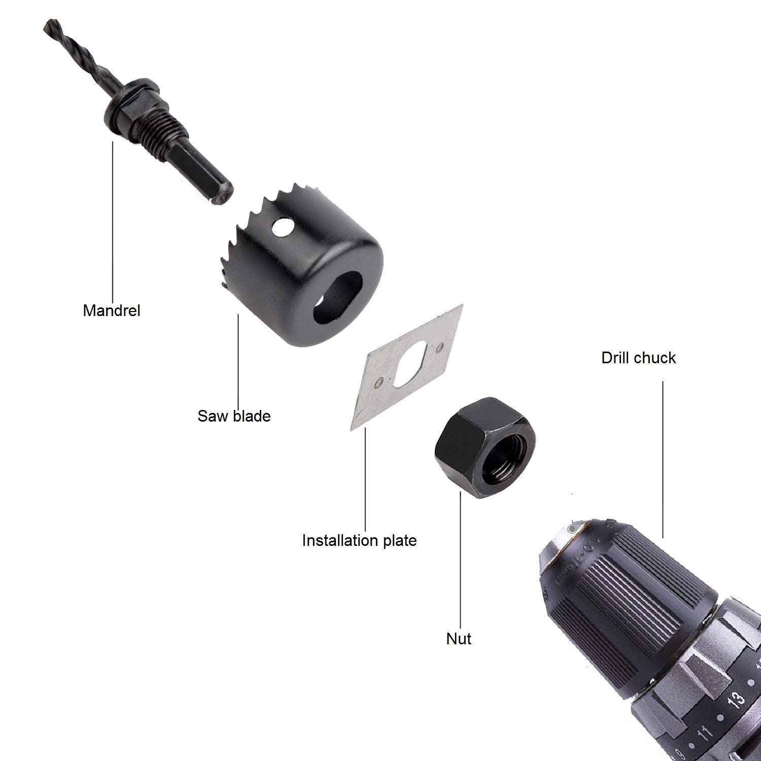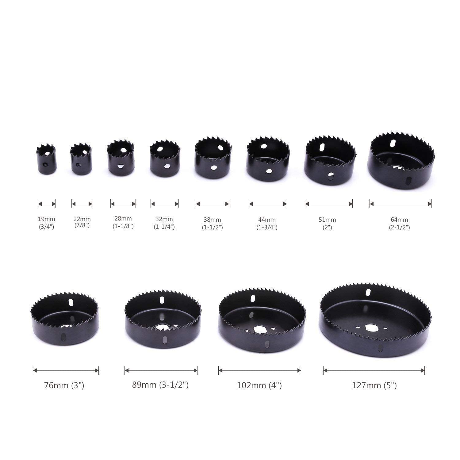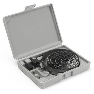 • Weight- 980g, Colour- black, Material- Hardened Steel, Package Contents- 12 Hole Saw's with Size- 3/4"-19mm, 7/8"-22mm, 1-1/8"-28mm, 1-1/4"-32mm, 1-1/2"-38mm, 1-3/4"-44mm, 2"-51mm, 2-1/2"-64mm, 3"-76mm, 3-1/2"-89mm, 4"-102mm, 5"-127mm, 2 Arbors, 1 Hex Key, 1 Drive plate.