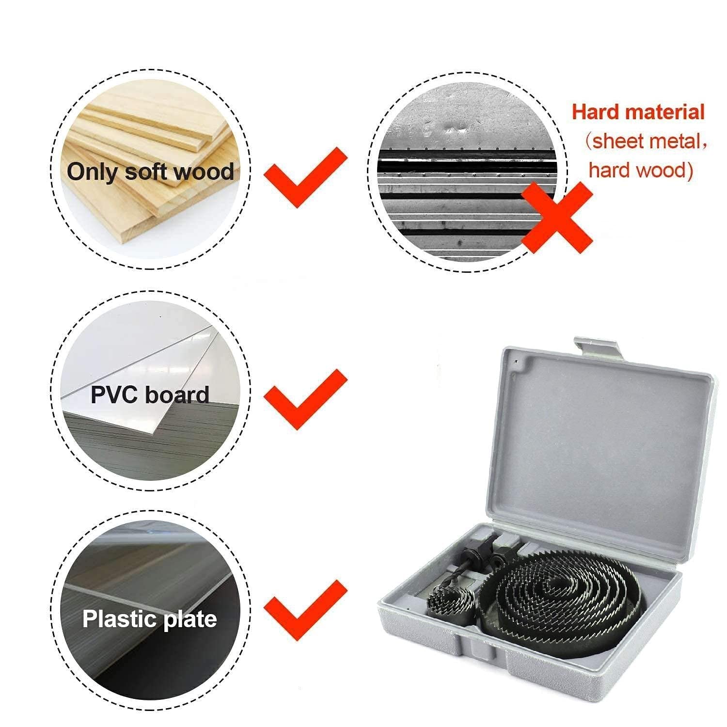 • Wood Hole Saw should be used on Wood, Plastic, Mica, Rubber, Leather and Other Soft Materials only.
