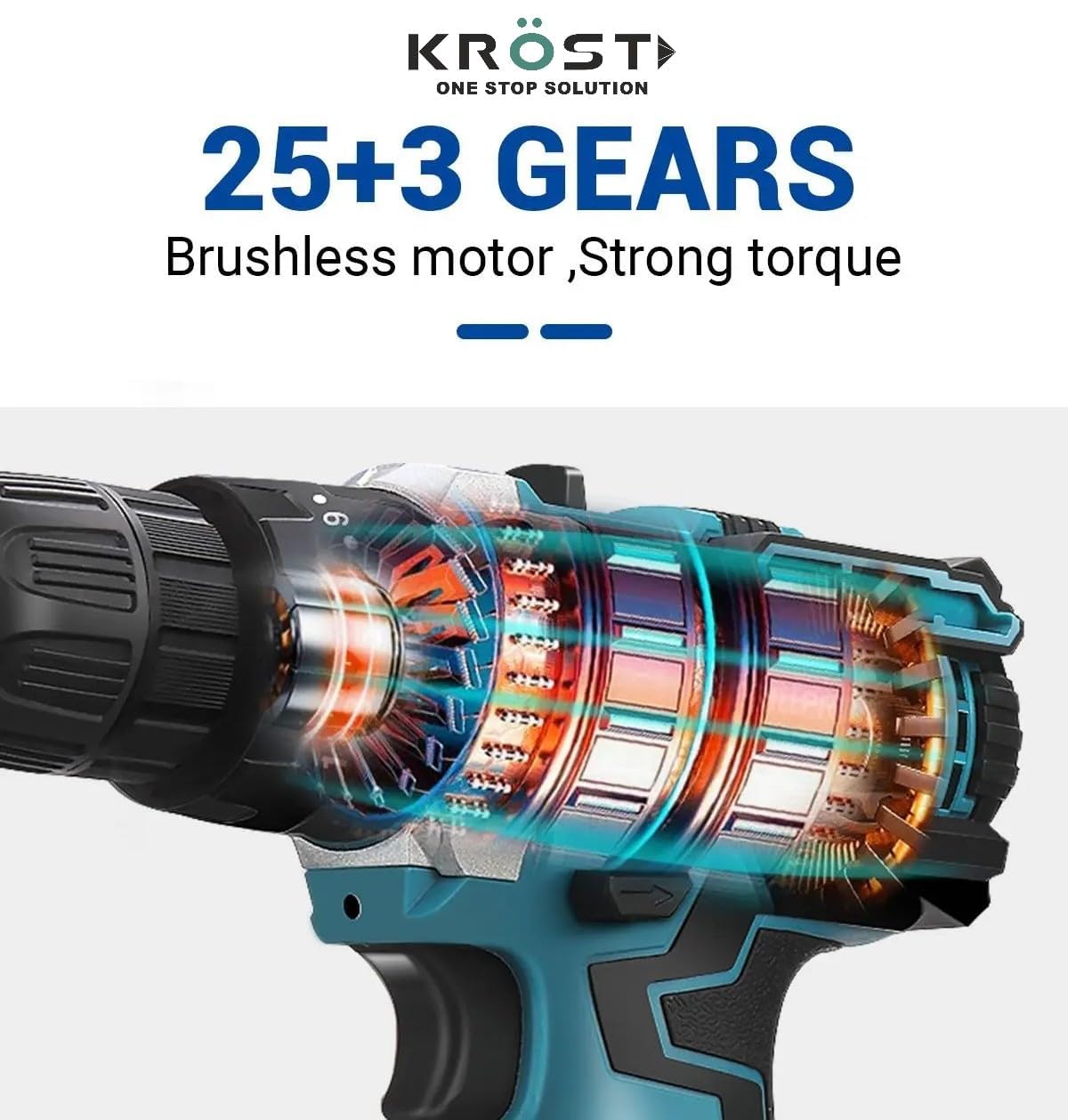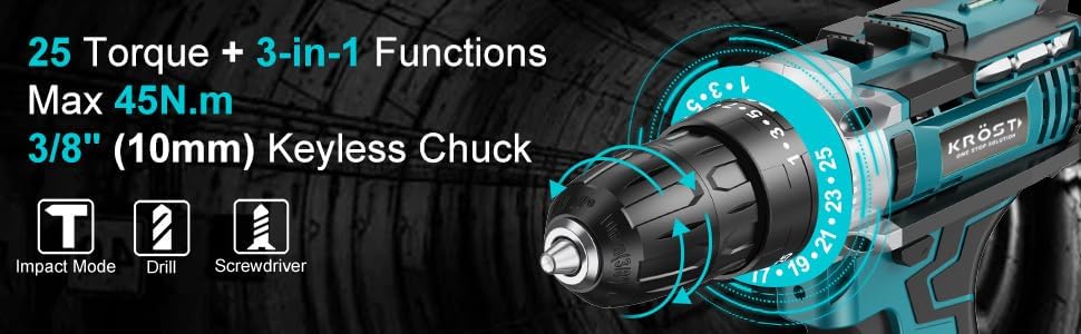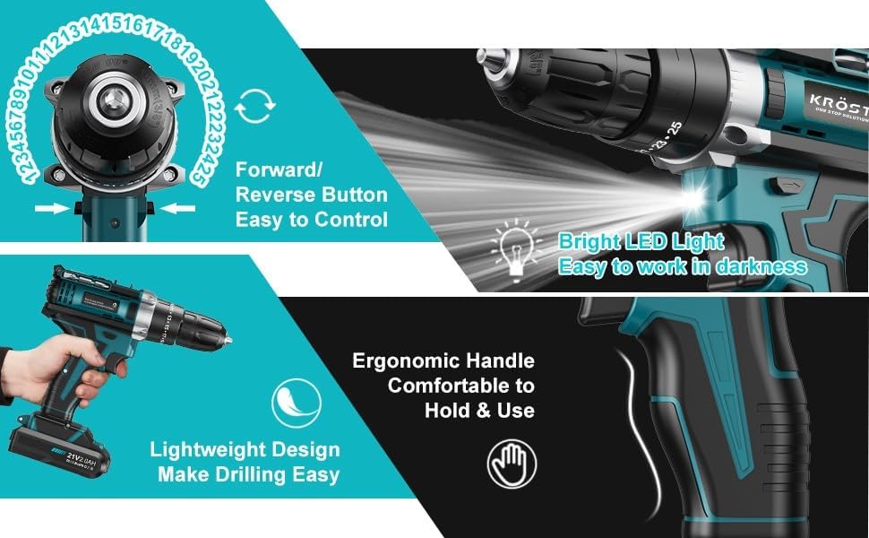 - : With this drill machine you can have screwing, drilling, and impact at the same point of time without changing the different power tools for this your different work need. For your safety and the machine KROST TOOLS provides a built-in bright LED light so you don't need to carry an additional light for working in the dark. Also the ventilation system ensures that your machine stays cool during working.