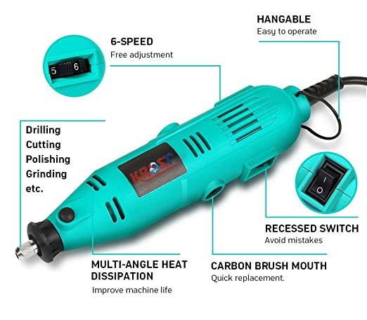 6 ADJUSTABLE ROTATION SPEED: This rotary tool equipped with a thumb wheel speed switch. Switch up the speed between 8,000 and 30,000rpm and with mini 16000rpm depending on the task at hand. By adjusting the speed you can make delicate engravings on wood, glass, metals, plastics, tile and other materials with control easily