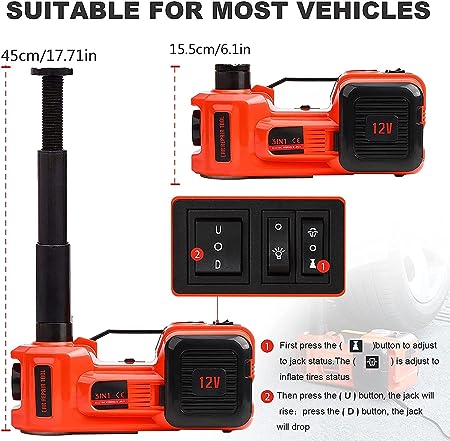 For Electric Jack: Input Voltage: 12V DC Max Current: 13A Rated Power: 150W Max Loading: 5 ton Lifting Height Range: 6.1 in. -17.7 in. (155mm-450mm) Power Cord Length: 11.5 ft. (3.5m)