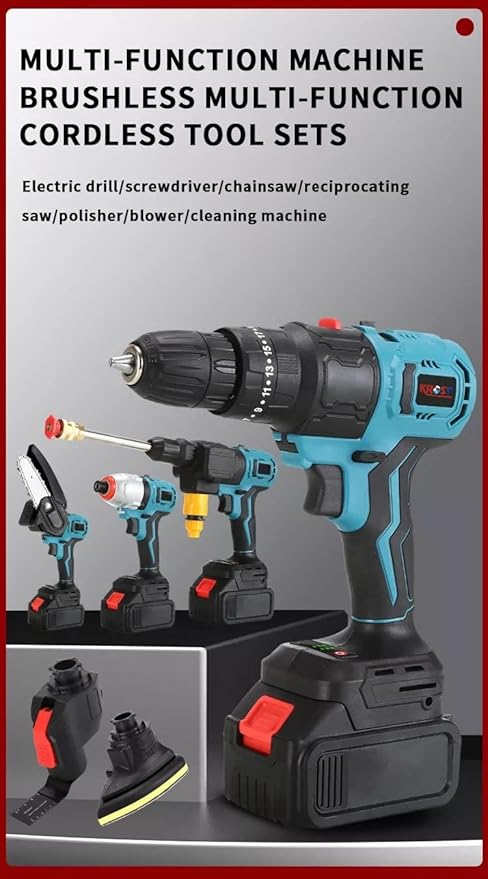 This kit includes 9 interchangeable tool heads, allowing users to switch between drill, hammer, saw, sander, blower, and more. The quick-connect system ensures seamless transitions, making it a best cordless drill kit for multi-purpose use in home and workshop settings.