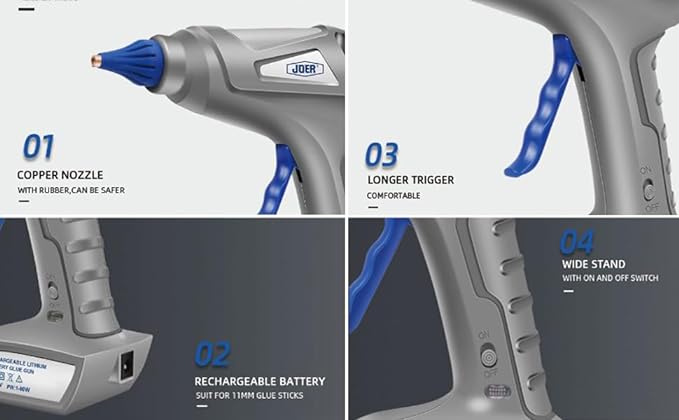 Cordless 60W Hot melt glue gun with the upgraded heating chamber to anti-drip the hot glue No falling & stand up glue gun will be ideal for crafter or DIYer, you may be annoyed by the messing because your glue gun fall over often. Now, try this heavy-duty hot glue gun that has a very stable stand-up base to keep your glue gun upright and ready for action. With this glue gun, you can create many craft projects and glue many DIY materials together to get beautiful crafts with personal style. Make simple repairs. Our glue stick size is 11mm Anti -Scalding silicone nozzle Extended Trigger