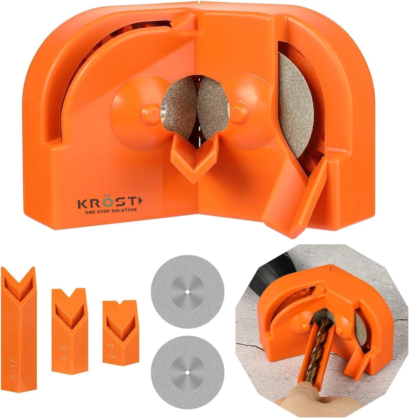 • rill Bit Grinding Sharpener with 3× Drill Bit Support, 2× Replacement Grinding Wheel Discs to sharpen different drill.
