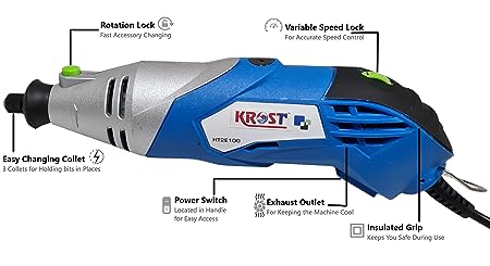 SPEED CONTROL: The KROST 170W Rotary Power Tool has an injection-moulded nylon body that safely houses its energetic 170W motor with a 1.9m cord for power outlet (230V 50Hz) connection. A rearward thumb-wheel speed control allows for between 8,000 to 35,000 rpm for precision speeds and time-saving operation