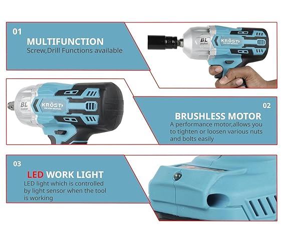 KROST Cordless impact wrench 1/2 inch max 1000nm(720 ft-lbs) breakaway torque, easily removing stubborn bolts and fasteners. It Can be applied to tire demolition, auto repair, machine repair, pipe repair, scaffolding and construction work, etc. Cordless impact wrench 1/2 with high performance brush motor. No sparks, no overheating, long service life. Excellent performance, up to 40% more service life. Power impact wrench with 3-stage torque selection. Control in your hands. Select different torques according to your task. Impact wrench 1/2 with super bright built-in led. Provides illumination at work. Auto-brake function ensures that the nut will not fall off easily when you remove it. Torque: 1000nm; RPM: 2300,4400. Brushless Motor makes it easy to loosen nuts, bolts and screws from bikes, motorcycles, engineering projects. High performance motor that increases service life and availability. Motor is brushless Battery and Charger are NOT INCLUDEDAdditional Information