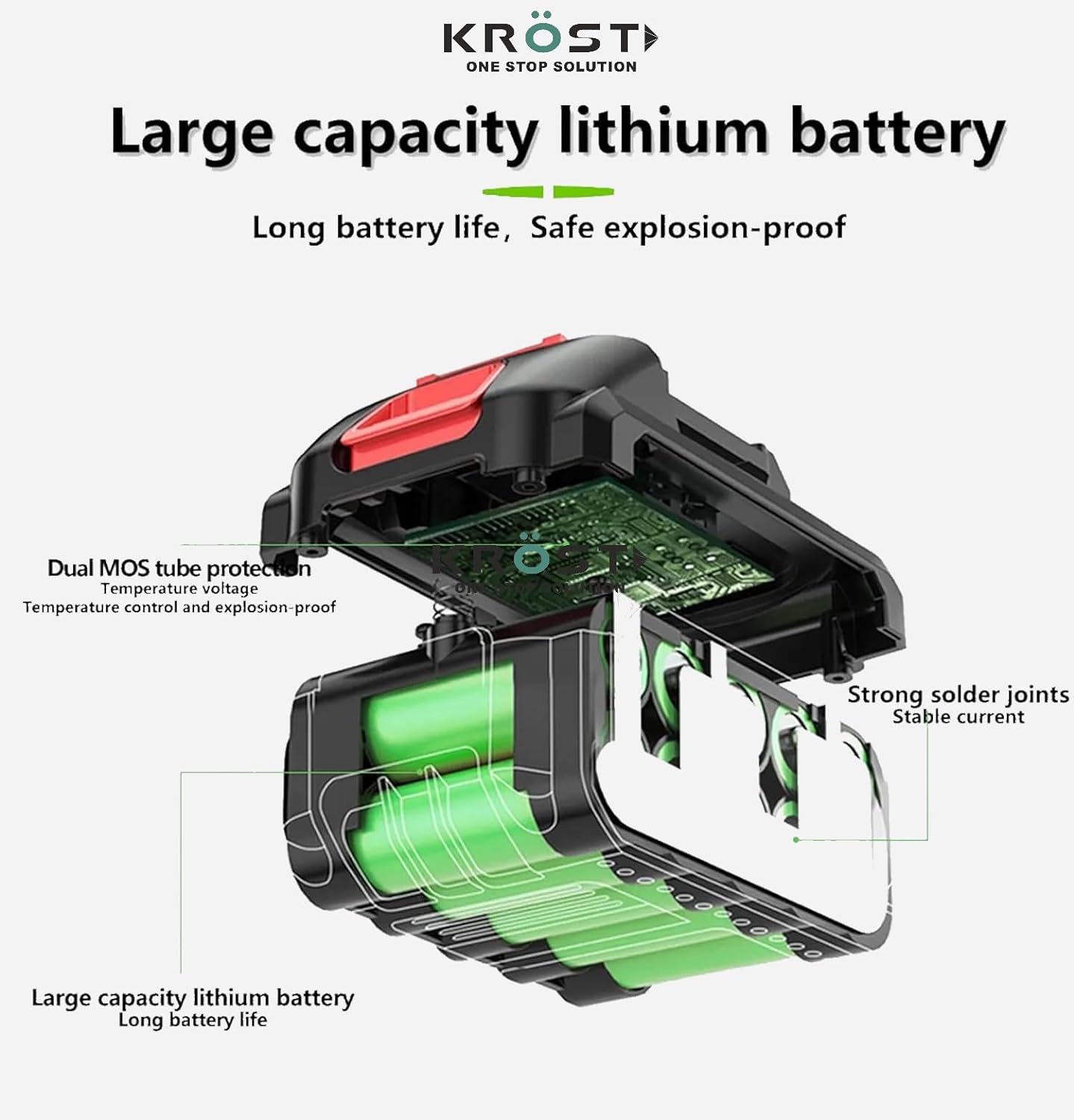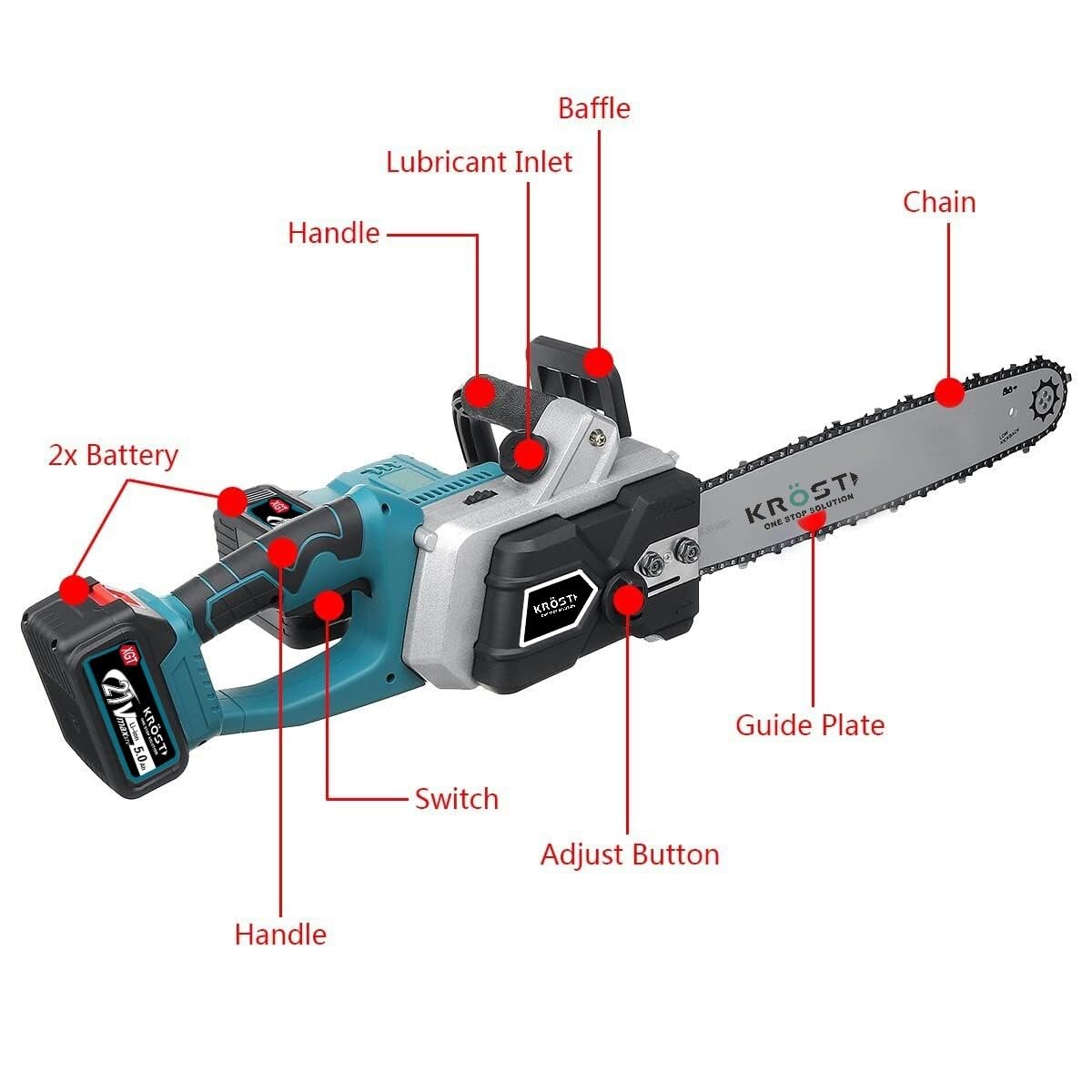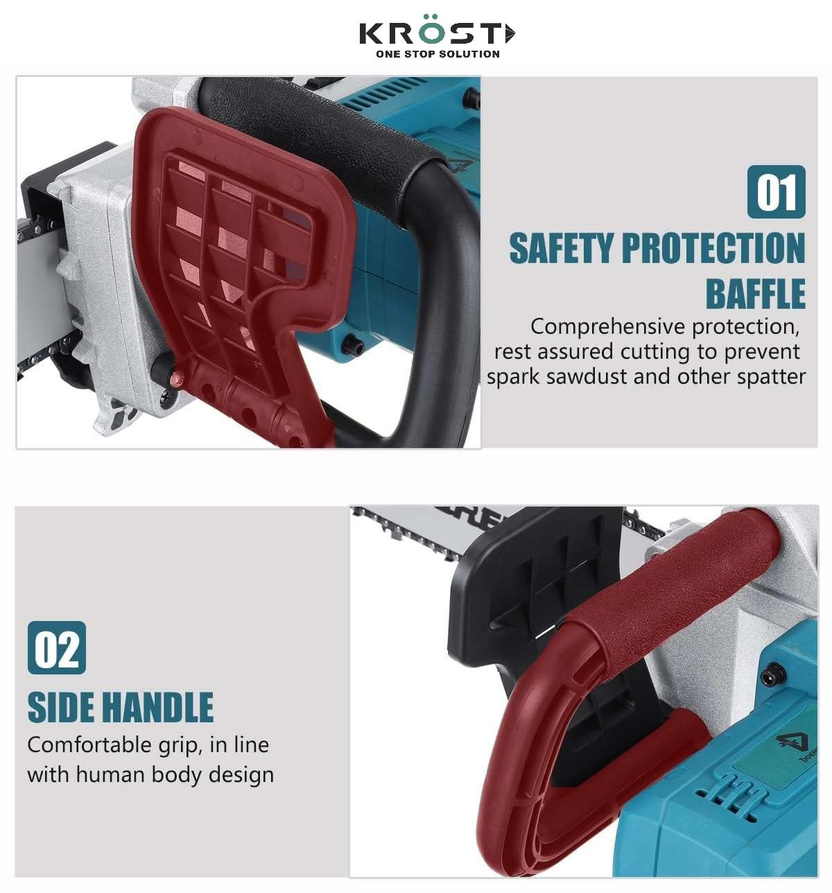 [STRONG DYNAMIC SYSTEM] KROST cordless chainsaw adapt high-quality guide chain which is deeply helping to ensure smooth cutting. As well, our chainsaw use a pure copper motor which is very powerful. It makes cutting efficiency higher and sooner.